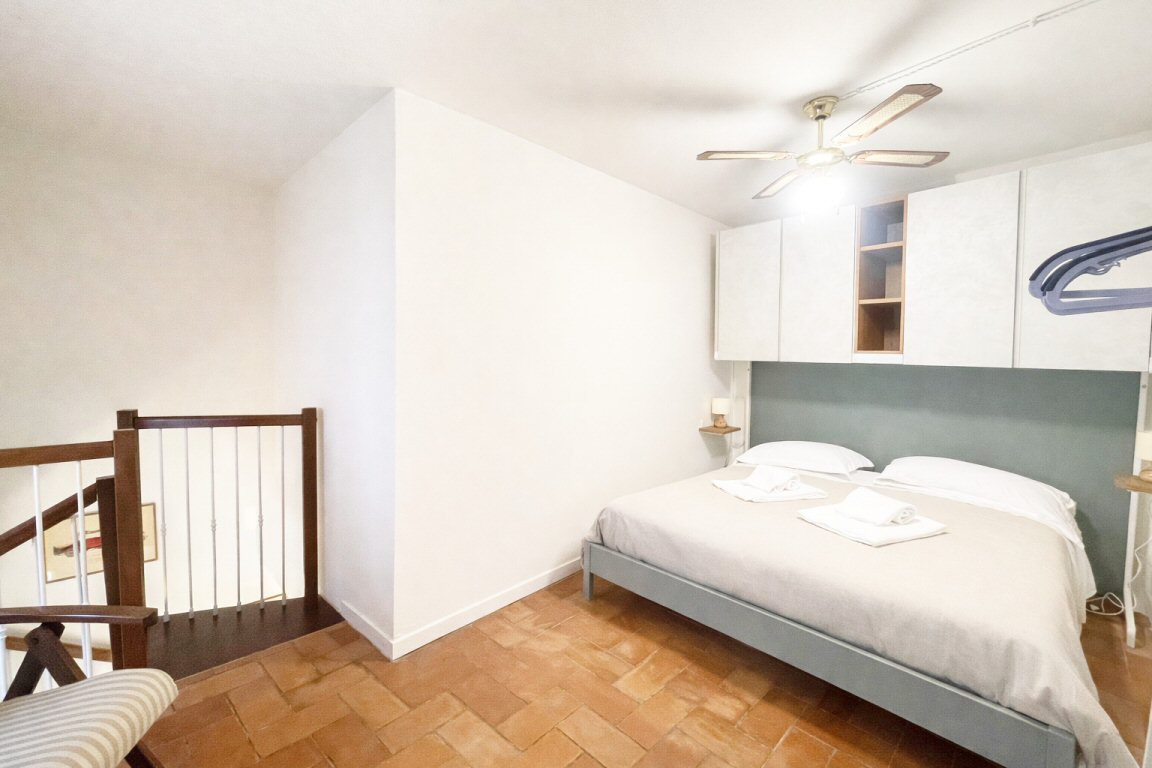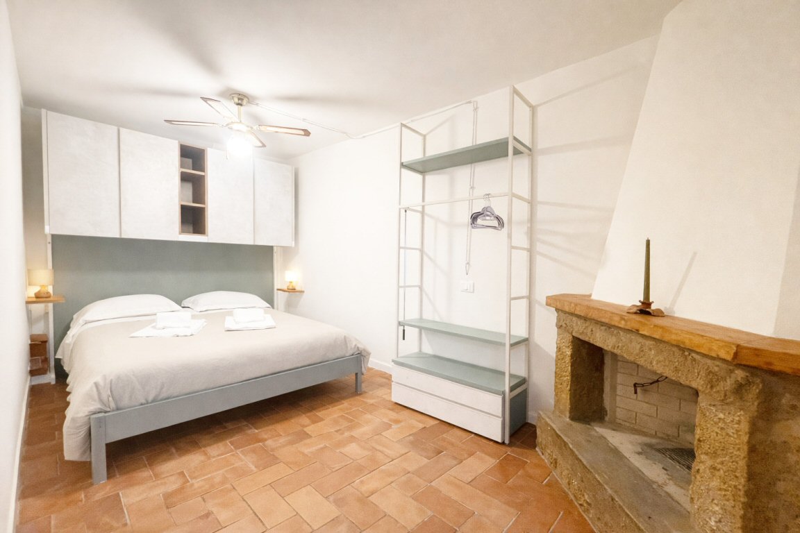Al piano superiore si trova la camera matrimoniale, tranquilla e accogliente, con arredi semplici che richiamano la tradizione toscana.